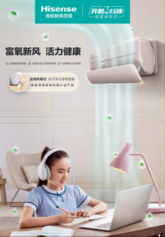 海信新風空調·春風系列搭載第四代柔風科技,做到“擋風不擋涼”,用“丘陵柔風科技”將硬風逐漸柔化,進一步提高了空調的舒適度,保證考生復習時不會因為冷風吹風導致感冒,影響身體健康。