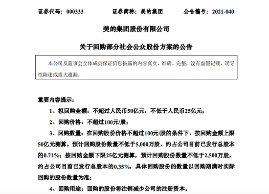- 新浪科技訊 5月10日早間消息,美的集團發布公告稱:擬回購公司股份,回購金額不低于25億元,不超過50億元,回購價格不超過100元每股。此外,公司控股股東美的控股在未來1