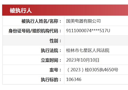 - 中國執行信息公開網顯示,10月9日-10日,國美電器有限公司新增4條被執行人信息,執行標的合計約1.55億元。中國執行信息公開網截圖 天眼查APP顯示,國美電器成立于2003