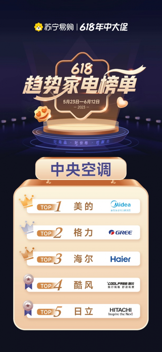 - 近日,618年中大促火熱進行,趨勢類家電成為最熱門商品之一。6月13日,蘇寧易購率先揭曉618趨勢家電榜單中的首個品類——中央空調。美的、格力、海爾、酷風和