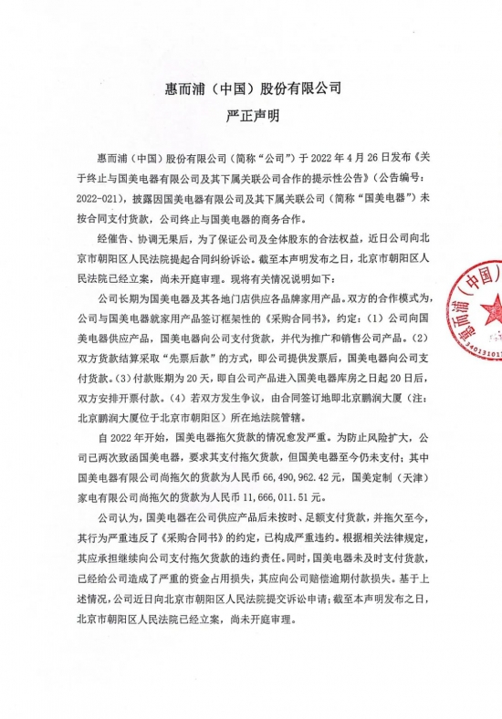 - 惠而浦再發聲明:因合同糾紛正式起訴國美電器