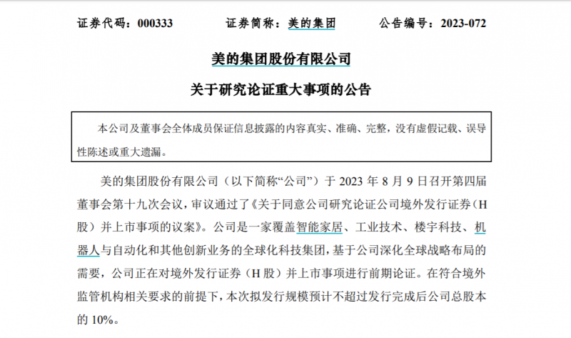 - 近日,家電龍頭美的集團(000333)宣布正在計劃H股上市,并稱該計劃是基于深化全球戰(zhàn)略布局的需要。根據(jù)公告,美的集團于當日審議通過了《關于同意公司研究論證公司境外發(fā)