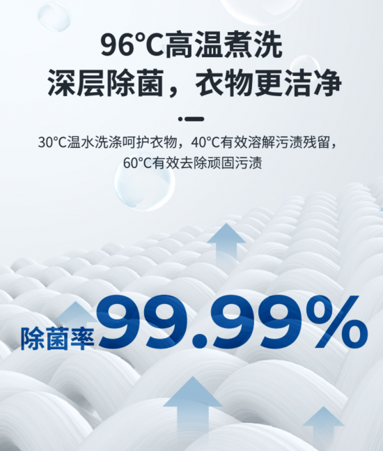 這款洗衣機(jī)擁有96℃高溫煮洗功能,深層除菌,除菌率高達(dá)99.99%,還能夠在高溫洗滌的基礎(chǔ)上有效溶解污漬殘留,祛除頑固污漬,讓衣服更加潔凈。