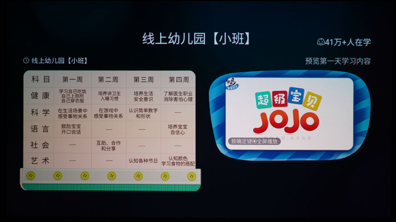 電視搭載海信久負盛名的聚好看平臺,整合了巨量的電影電視劇、綜藝真人秀等內容資源。此外,電視還擁有從嬰幼兒啟蒙教育到小學初高中課程,再到職業教育、老年大學等各個年齡段的教育資源,還可以根據用戶輸入的年齡自動匹配適合的內容。
