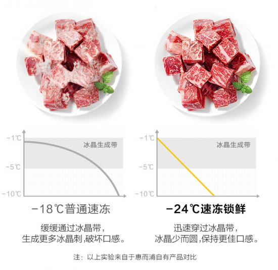 如此看來,要想要冷凍食品保持新鮮口感與營養,冷凍必須得“加大力度”。惠而浦冷鏈運輸級-24°C速凍鎖鮮便是鎖住營養美味的“大力選手”,強力低溫能在較短時間內將大塊食材凍透,迅速穿過冰晶生成帶從而減少冰晶生成,保持更佳口感,鎖住食材營養,保鮮更持久。經大冷凍力“照料”的鮮肉解凍后也幾乎不會有血水,新鮮肉類原有口感得以完整保存,還能減少營養流失。