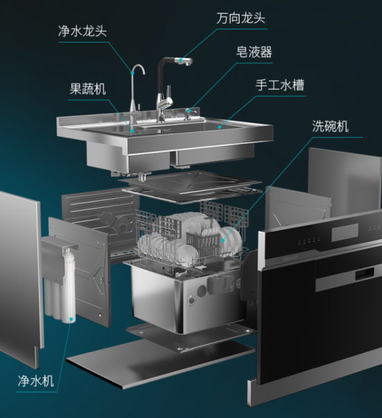 森歌U8除菌集成洗碗機不僅僅是一臺洗碗機那么簡單。它更是集洗碗機、保潔柜、凈水機、手工水槽、瀝水簾、果蔬機、萬向龍頭、皂液器、櫥柜為一體的集成式廚房“凈洗中心”。