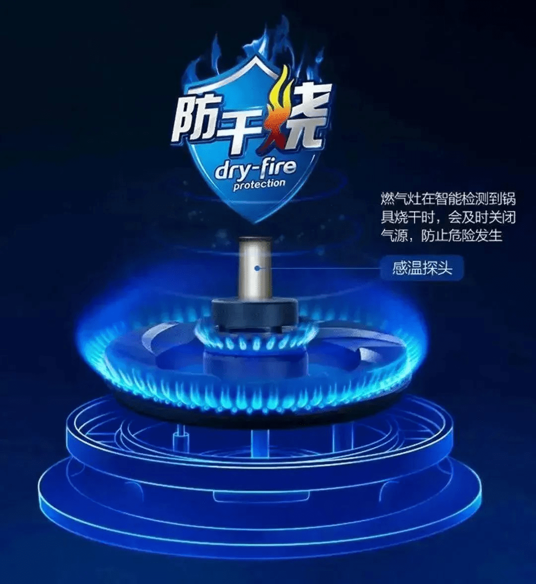 技術大突破:首創防干燒科技,在燒干鍋、不坐鍋時自動切斷氣源。