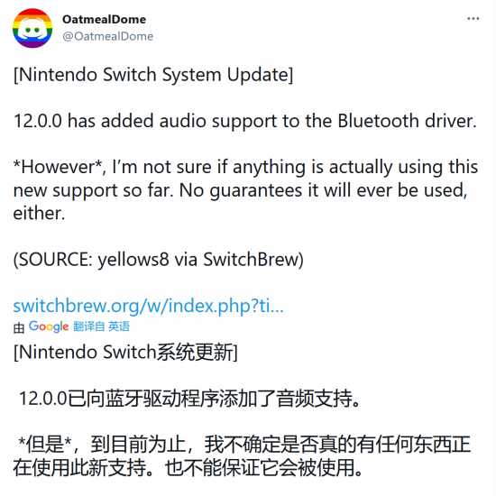 此外,OatmealDome還發現了12.0.0固件增加了對于藍牙音頻的支持,或許SwitchPro也將支持藍牙耳機等設備,彌補此前版本主機不支持藍牙耳機的遺憾。