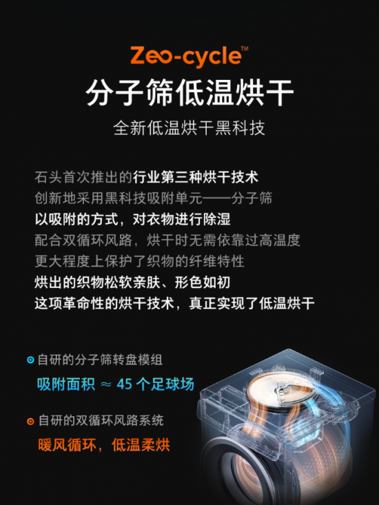 石頭科技從2019年開始研究分子篩材料,經過了上千次的試驗,終于找到讓分子篩的晶型結構趨于完美的方法,讓分子篩對水分子的吸附能力達到了更高的水平。由石頭科技自研的分子篩模組,吸水能力實現了新的突破,吸附面積可以達到28.8萬平方米,搭配上創新自研的雙循環風路系統,保證了在沒有主動熱源參與之下,真正實現低溫烘干。并且,由于分子篩使用壽命長、無衰減的特性,使石頭洗烘一體機長期使用也不會降低吸附效率。