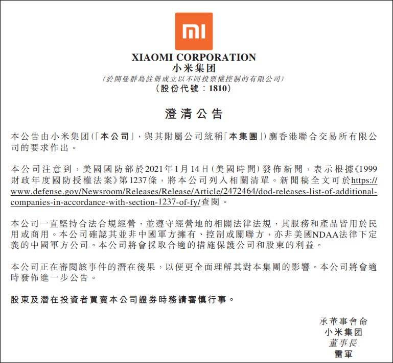 【劃重點】: 小米集團港交所公告顯示,美東時間5月25日下午4時09分,美國哥倫比亞特區地方法院頒發了最終判決,解除了美國國防部對于本公司“中國軍方公司”的認定,正式撤銷了美國投資者購