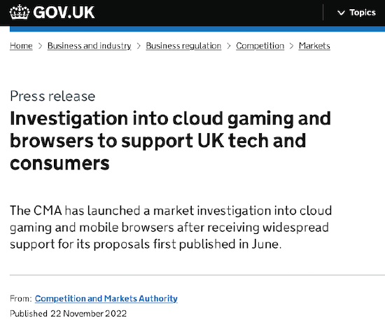 在英國,今年6月,CMA就啟動相關市場調查進行了公眾咨詢。11月22日公布的結果顯示,大量意見支持開展更全面的調查,以厘清蘋果和谷歌主導移動瀏覽器市場的方式,以及蘋果如何通過其應用程序商店限制云游戲的上線。
