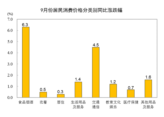 9月份,食品煙酒類價格同比上漲6.3%,影響CPI(居民消費價格指數)上漲約1.73個百分點。食品中,鮮果價格上漲17.8%,影響CPI上漲約0.31個百分點;畜肉類價格上漲16.0%,影響CPI上漲約0.50個百分點,其中豬肉價格上漲36.0%,影響CPI上漲約0.45個百分點;鮮菜價格上漲12.1%,影響CPI上漲約0.25個百分點;蛋類價格上漲7.3%,影響CPI上漲約0.05個百分點;糧食價格上漲3.6%,影響CPI上漲約0.06個百分點;水產品價格上漲2.8%,影響CPI上漲約0.06個百分點。