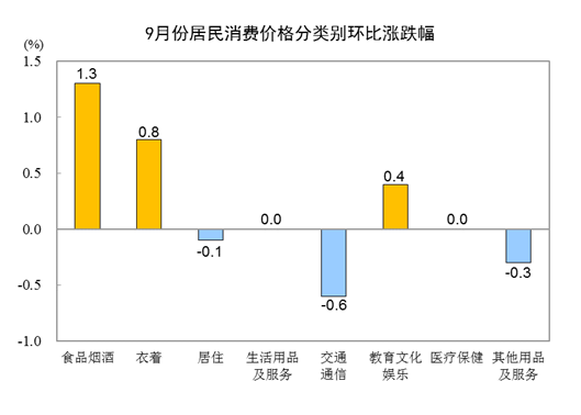 9月份,全國居民消費價格環比上漲0.3%。其中,城市上漲0.3%,農村上漲0.4%;食品價格上漲1.9%,非食品價格持平;消費品價格上漲0.6%,服務價格下降0.1%。