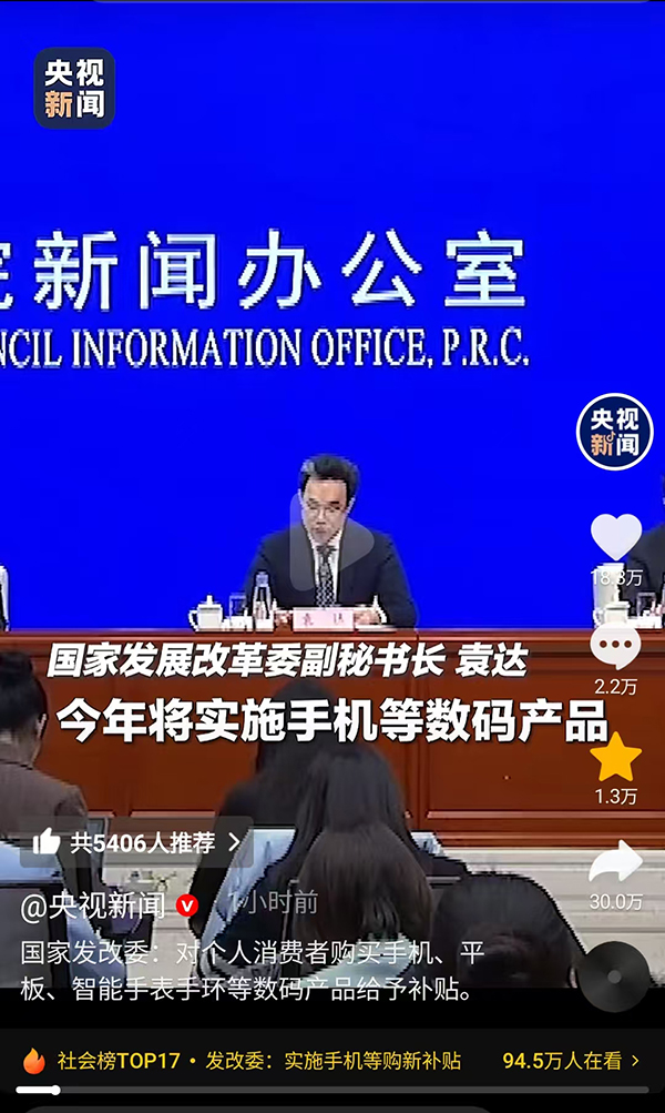 - 2025年初,國家發展改革委宣布將加力擴圍實施“兩新”政策,即新一輪大規模設備更新和消費品以舊換新,其中特別提到將對個人消費者購買手機、平板、智能手表手環等3類數碼產品給予