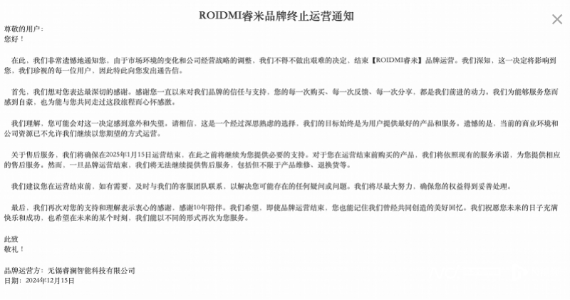 - 12月15日,掃地機品牌ROIDMI睿米官網(wǎng)發(fā)布通知稱,“由于市場環(huán)境的變化和公司經(jīng)營戰(zhàn)略的調(diào)整,我們不得不做出艱難的決定,結(jié)束睿米品牌運營。” 分享