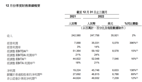【家電資訊-家電新聞 - 渠道資訊,作者:編輯】23日晚,阿里巴巴公布了2022年第四季度的業績報告。報告顯示,其第四季度營收同比增長2%至2477.56億元,凈利潤為457.46億元,同比增長138%,主要由于數字媒體及娛樂分部相關的商譽減值減少224.27億元。