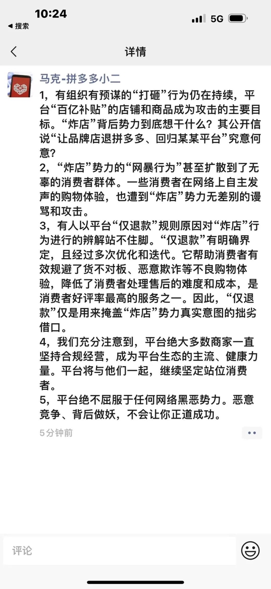 這一切都在說明,事件最終的結果可能和“炸店”勢力的表面想達到的目的相反。拼多多小二進行了強硬的回應,并指出“僅退款”只是用來掩蓋“炸店”勢力真實意圖的拙劣借口和操作手段,背后勢力另有所指。