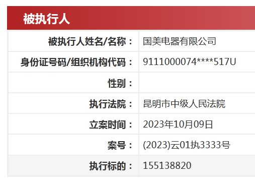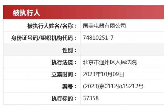 【家電資訊-家電新聞 - 渠道資訊,作者:編輯】中國執行信息公開網顯示,10月9日-10日,國美電器有限公司新增4條被執行人信息,執行標的合計約1.55億元。