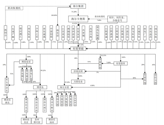 股權方面,海爾集團通過海爾卡奧斯間接控制有屋家居41.61%的股權,通過君一控股控制有屋家居3.50%股權,同時劉斥、劉昌龍、少海壹號將其持有的有屋家居共計7.69%股權所對應的表決權委托給海爾卡奧斯行使。通過上述持股及安排,海爾集團合計控制有屋家居52.79%股權的表決權,系有屋家居的實際控制人。