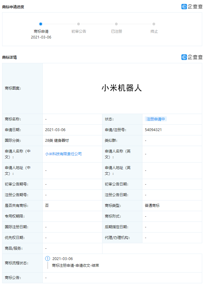 【劃重點(diǎn)】: 企查查APP顯示,3月6日,小米科技有限責(zé)任公司新增“小米機(jī)器人”商標(biāo)申請(qǐng)信息,國(guó)際分類為健身器材,目前商標(biāo)狀態(tài)為“注冊(cè)申請(qǐng)中”。