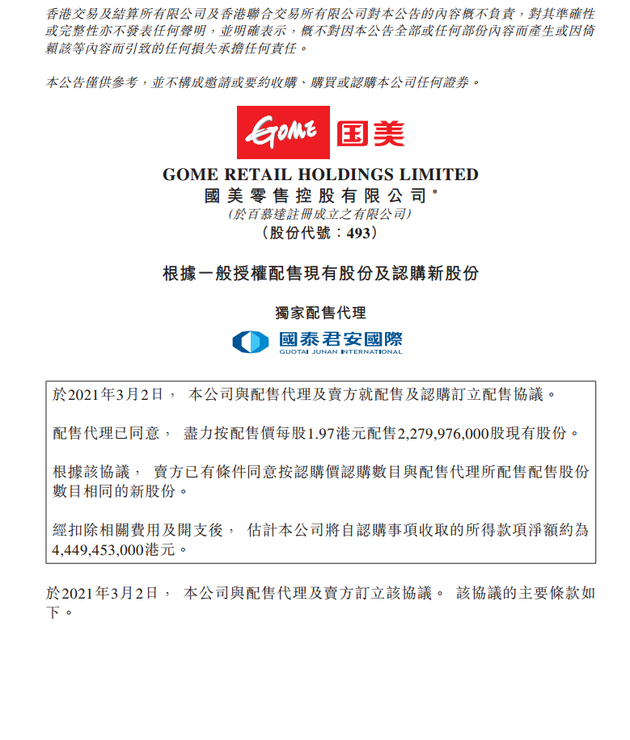 【劃重點】: 北京時間3月2日早間消息,國美零售在港交所發布公告,于2021年3月2日與配售代理及賣方就配售及認購訂立配售協議,按配售價每股1.97港元配售22.8億股股票。經扣除相關費用及開支后,估計所