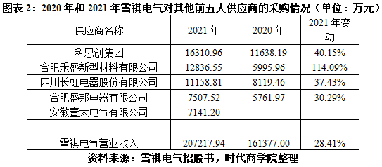 如圖表2所示,時代商學院對比了雪祺電氣對其他前五大供應商的采購情況發現,2021年,雪祺電氣對禾盛新材的采購增速遠高于其他前五大供應商,也高于雪祺電氣同期的營收增速。