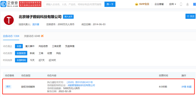 - 錘子科技股權(quán)凍結(jié)信息清零,5000萬股權(quán)被解凍