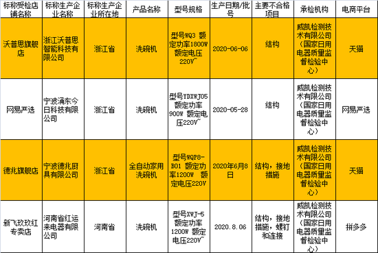 對于洗碗機,抽查了5個省(市)20家企業生產的20批次產品,其中4批次產品不合格,不合格發現率為20.0%。不合格項目涉及結構、接地措施、螺釘和連接。其中,在天貓平臺德兆旗艦店銷售的寧波德兆廚具有限公司生產的一款全自動家用洗碗機和拼多多平臺新飛玖玖紅專賣店銷售的河南省紅運來電器有限公司生產的一款洗碗機的接地措施項目不合格,容易產生觸電風險。