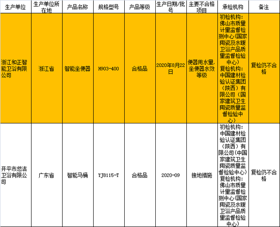 在智能坐便器的抽查中,浙江和正智能衛浴有限公司生產的一款智能坐便器的便器用水量,坐便器水效等級不合格。