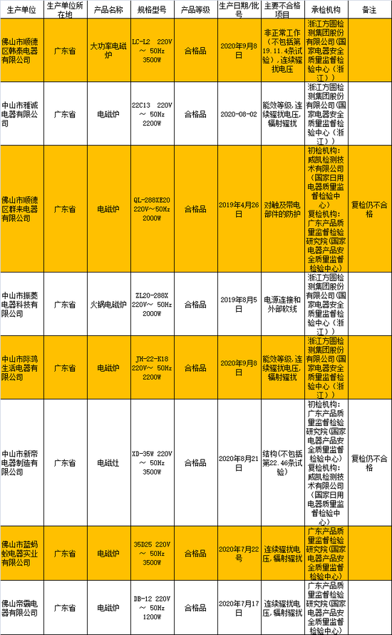 對于電磁灶,在所抽查的4個省(市)66家企業生產的66批次產品,其中8批次產品不合格,不合格發現率為12.1%。其中,佛山市順德區韓泰電器有限公司,中山市雅誠電器有限公司,佛山市順德區群來電器有限公司,中山市振菱電器科技有限公司,中山市際鴻生活電器有限公司,佛山市藍螞蟻電器實業有限公司,佛山帝霸電器有限公司等企業的不合格產品存在安全風險。