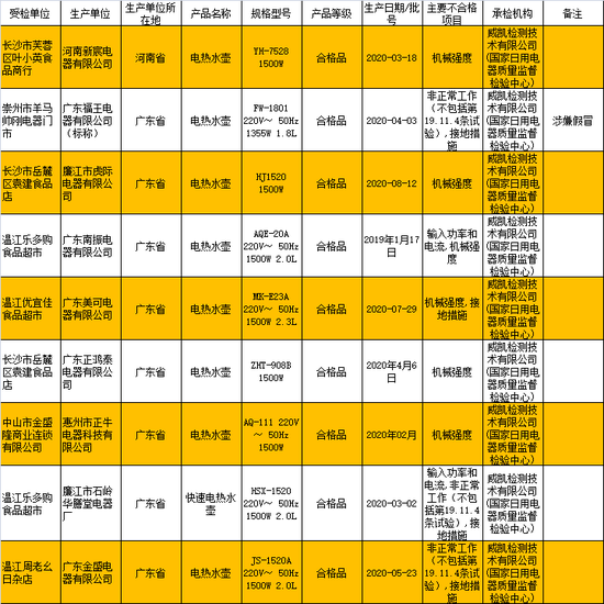 對于電熱水壺,抽查了5個省41家企業生產的66批次產品,其中1批次產品涉嫌假冒。檢驗發現9批次產品不合格,不合格發現率為13.6%。不合格項目涉及輸入功率和電流、非正常工作、機械強度、接地措施。不合格產品涉及的企業包括河南新宸電器有限公司,廣東福王電器有限公司(標稱),廉江市虎際電器有限公司,廣東南振電器有限公司,廣東美可電器有限公司,廣東正鴻泰電器有限公司,惠州市正牛電器科技有限公司,廉江市石嶺華膳堂電器廠,廣東金盛電器有限公司。