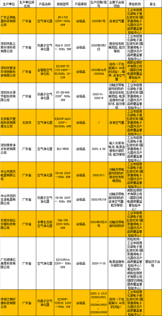對于空氣凈化器,監管部門抽查了8個省(市)39家企業生產的40批次產品,其中11批次產品不合格,不合格發現率為27.5%。有7批次不合格產品存在與安全性相關的項目不合格,涉及的生產企業包括深圳市凱立泉環保科技有限公司,深圳市愛派環保物聯科技有限公司,深圳市永源節能科技有限公司,深圳常泉凈水科技有限公司,中山市英氏電器有限公司,中山市優的生活電器有限公司,東莞市柏業環境科技有限公司,廣東順德億美思科技有限公司等。