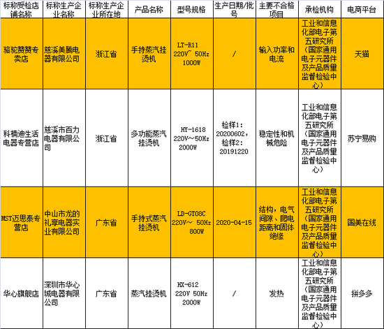 對于織物蒸汽機,監管部門抽查了6個省(市)39家企業生產的40批次產品,其中3批次涉嫌假冒。檢驗的37批次產品中,有4批次產品不合格,不合格發現率為10.8%。其中,天貓平臺駱駝贊贊專賣店銷售的慈溪美騰電器有限公司生產的一款手持蒸汽掛燙機的輸入功率和電流不合格,蘇寧易購平臺科楠迪生活電器專營店銷售的慈溪市百力電器有限公司生產的一款多功能蒸汽掛燙機的穩定性和機械危險項目不合格, 國美在線平臺MST邁思泰專營店銷售的中山市龍的禮享電器實業有限公司生產的一款手持式蒸汽掛燙機的電氣間隙、爬電距離和固體絕緣等項目不合格,拼多多平臺華心旗艦店銷售的深圳市華心城電器有限公司生產的一款蒸汽掛燙機的發熱項目不合格。這些項目不合格的產品容易在使用過程中引發觸電、起火等風險。