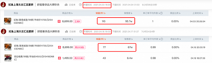 根據(jù)蟬媽媽的數(shù)據(jù),妃魚的頭部主播夏妍(直播賬號:妃魚上海太古匯店夏妍),今年4月以來共直播了9場,其中售出的LV包中,銷量最高的是4月3日一款單價8699元LV手提包,共賣出了110件,銷售額占到當(dāng)場總額近30%的比例。而就在昨日(4月16日),這款LV手提包再次出現(xiàn)在直播間,并以77件居銷量首位。也就是說,同款包在兩場直播中賣出近200件,遠超二奢行業(yè)的平均水平。