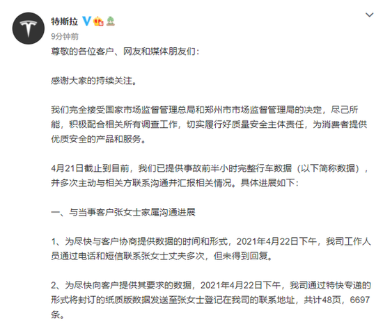 4月21日截止到目前,我們已提供事故前半小時完整行車數據(以下簡稱數據),并多次主動與相關方聯系溝通并匯報相關情況。具體進展如下: