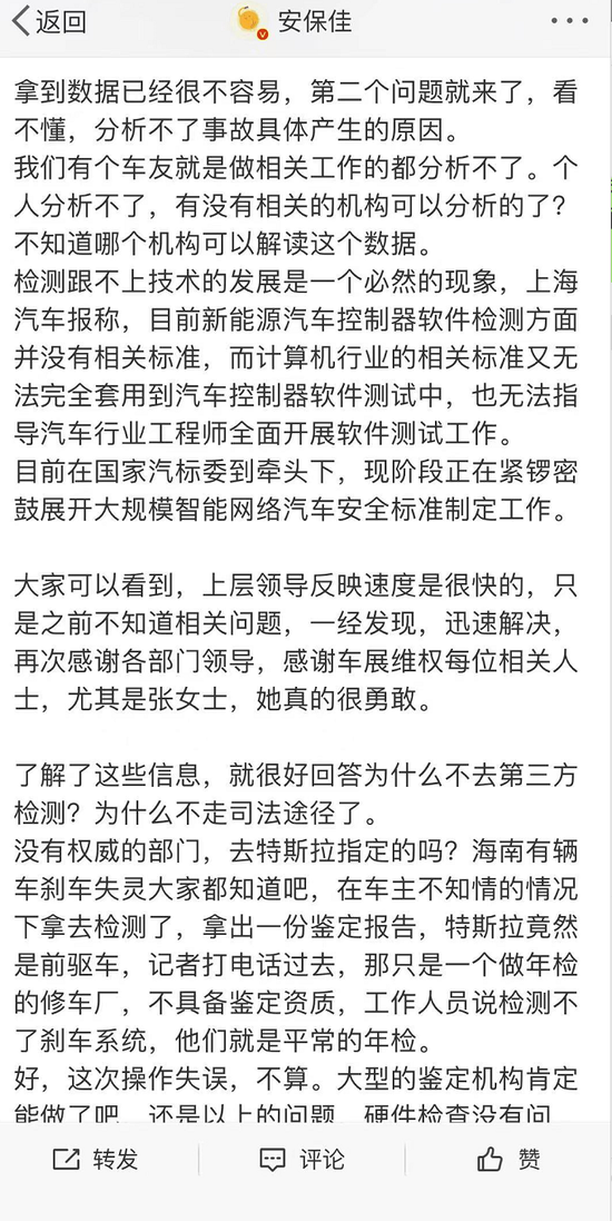 在特斯拉公布數據還原事故一分鐘前情況后不久,另一位參與維權的車主安保佳通過微博發聲,回應為何不去做第三方鑒定。他表示“檢測跟不上技術”,權威鑒定機構難尋成為當下智能汽車爭議事故后,車主遭遇的窘境。
