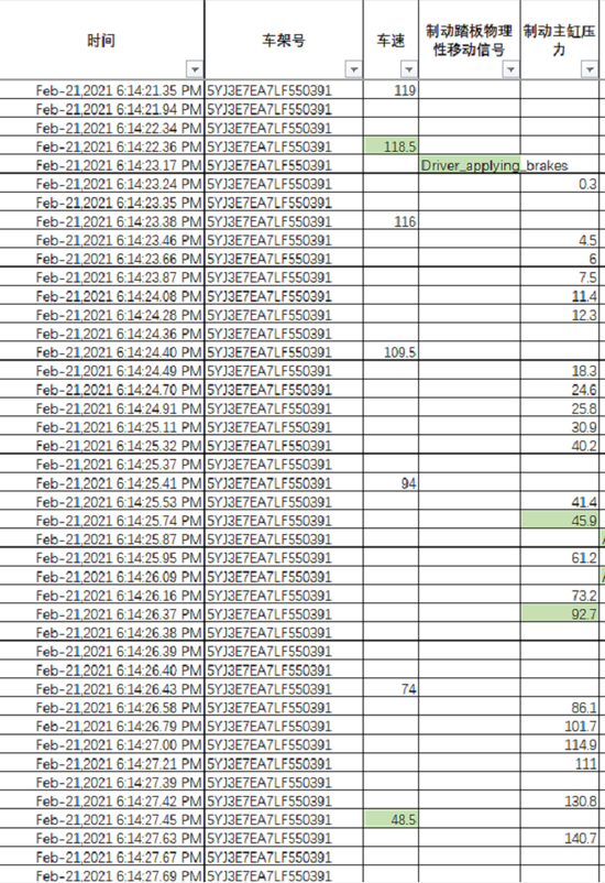 特斯拉還作出了一份文字說明稱,在駕駛員最后一次踩下制動踏板時,數據顯示,車輛時速為118.5千米每小時。在駕駛員踩下制動踏板后的2.7秒內,最大制動主缸壓力僅為45.9bar,之后駕駛員加大踩下制動踏板的幅度,制動主缸壓力達到了92.7bar,緊接著前撞預警及自動緊急制動功能啟動(最大制動主缸壓力達到了140.7bar)并發揮了作用,減輕了碰撞的幅度,ABS作用之后的1.8秒,系統記錄了碰撞的發生。駕駛員踩下制動踏板后,車速持續降低,發生碰撞前,車速降低至48.5千米每小時。