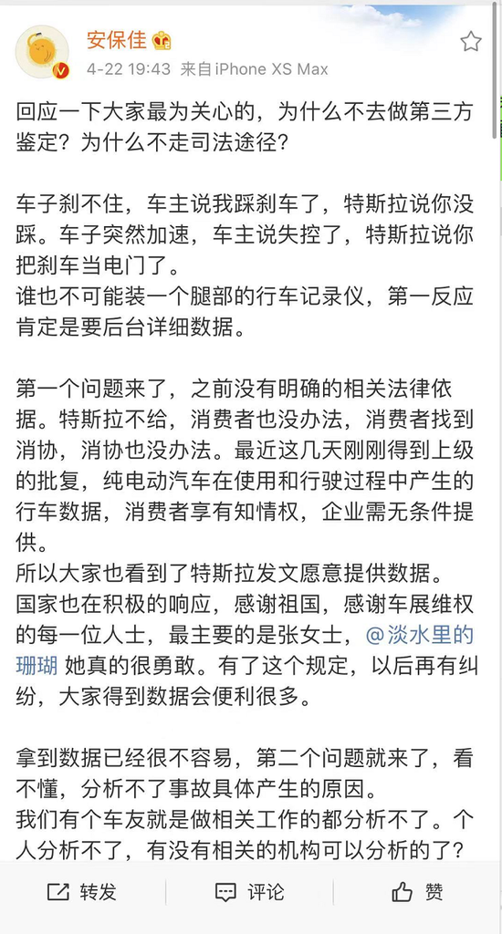 安保佳在微博中首先對特斯拉開始提供數據表示了欣喜。他表示,感謝祖國和維權人士。“之前沒有明確的相關法律依據。(后臺數據)特斯拉不給,消費者也沒辦法,消費者找到消協,消協也沒辦法。最近這幾天剛剛得到上級的批復,純電動汽車在使用和行駛過程中產生的行車數據,消費者享有知情權,企業需無條件提供。有了這個規定,以后再有糾紛,大家得到數據會便利很多。”