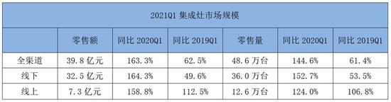 集成灶的漲勢則更為喜人。2021年一季度,集成灶全渠道零售額達39.8億元,同比大漲了163.3%,零售量達48.6萬臺,同比大漲了144.6%。