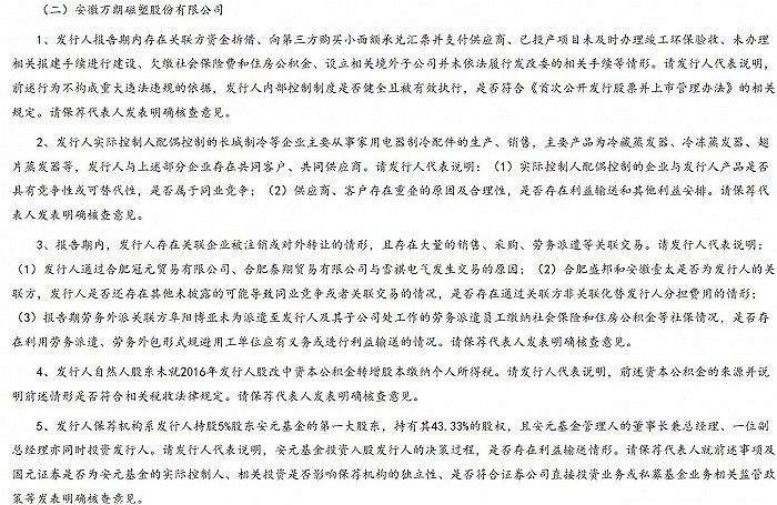 此外,持有萬朗磁塑4.8193%股份的股東安元基金是保薦機(jī)構(gòu)國元證券的聯(lián)營企業(yè),國元證券持有其 43.33%的股權(quán),而安元管理的董事長劉振、副總經(jīng)理周利華、員工章法寶和梁明還是萬朗磁塑持股方,合計(jì)持股比例為0.2458%。