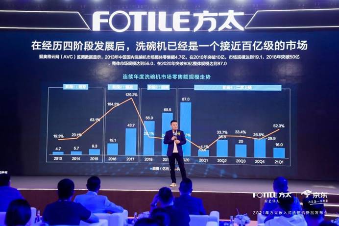奧維云網(wǎng)總裁郭梅德的發(fā)言中從整體家電大盤數(shù)據(jù)的宏觀角度切入,他強(qiáng)調(diào)洗碗機(jī)進(jìn)入中國(guó)市場(chǎng)已有二十多年,回顧洗碗機(jī)在中國(guó)市場(chǎng)的發(fā)展,大致可分為4個(gè)階段。2013年-2015年為萌芽階段,消費(fèi)者對(duì)洗碗機(jī)品類的認(rèn)知相對(duì)較淺,購(gòu)買廚電產(chǎn)品時(shí)更多關(guān)注基本需求,而非品質(zhì)需求。洗碗機(jī)在當(dāng)時(shí)屬于由外資主導(dǎo)的小眾產(chǎn)品;2015年起,洗碗機(jī)進(jìn)入爆發(fā)階段。當(dāng)時(shí)方太全球首發(fā)的水槽式洗碗機(jī),迅速激活國(guó)內(nèi)洗碗機(jī)市場(chǎng)。進(jìn)入2018年,洗碗機(jī)品類自身發(fā)展進(jìn)入瓶頸,加之房地產(chǎn)限購(gòu)政策影響,市場(chǎng)開(kāi)始回調(diào)。同時(shí),水槽式產(chǎn)品逐漸被嵌入式替代;2020年至今,受疫情推動(dòng),洗碗機(jī)進(jìn)入二次爆發(fā)階段。消費(fèi)者購(gòu)買傾向呈現(xiàn)套系化。消費(fèi)者流量雖下降,但客單量大幅提升。奧維云網(wǎng)(AVC)推總預(yù)測(cè)數(shù)據(jù)顯示,2020年臺(tái)式產(chǎn)品的短暫性爆發(fā)過(guò)渡到2021年后將不再延續(xù),21年洗碗機(jī)零售量將在20年基數(shù)上小幅回落至19.9%的增速,同時(shí)在規(guī)模方面因?yàn)?a href=http://m.13269526841.cn/ target=_blank class=infotextkey>價(jià)格改善,市場(chǎng)將首次突破100億。方太此次發(fā)布嵌入式洗碗機(jī)是對(duì)自身產(chǎn)品布局一次強(qiáng)有力的補(bǔ)位,更是彰顯著方太對(duì)未來(lái)超百億級(jí)市場(chǎng)絕對(duì)的信心和領(lǐng)導(dǎo)力。