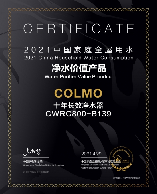 正是憑借著領先行業的技術突破、產品創新,在剛剛落幕的“舒適沐浴 健康飲水 2021中國家庭全屋用水智享論壇”上,COLMO十年長效凈水器CWRC800-B139一舉斬獲“2021中國家庭全屋用水凈水價值產品獎” 。COLMO則是榮獲“2021中國家庭全屋用水凈水行業貢獻獎” 。