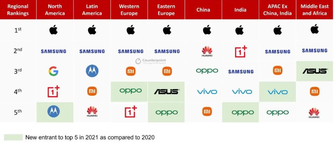 2021年,全球智能手機市場出貨前五名的品牌中,國內(nèi)廠商就占據(jù)了三席。