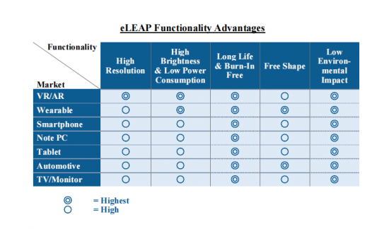 據了解,“eLEAP”是全球首個使用無掩模沉積和光刻技術準備量產的OLED技術。 值得注意的是,JDI指出,“eLEAP”還只是一個臨時名稱,有待注冊。該英文縮略詞“eLEAP”具有以下涵義:環境友好型、無掩模沉積光刻、超長壽命、低功耗和高亮度、任何形狀的圖案。