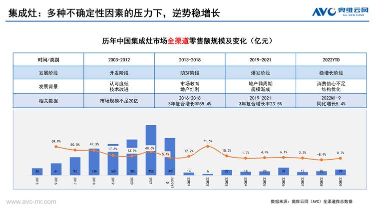 趙志偉指出,集成灶是近幾年家電產業增長最好的大家電品類之一,在多種不確定性因素的壓力下,逆勢穩增長。據奧維云網(AVC)推總數據顯示,2022年前三季度,集成灶市場規模190億元,同比增長5.4%。