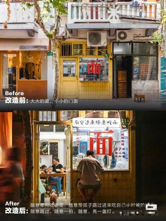 考慮到不少客人晚上吃面太暗,店門口新設了燈箱和拴狗鏈,顧客告訴朔亦,“能帶狗狗去吃面了,再晚也有燈箱照亮。”而店內原先只掛著菜單的墻面改成了“回憶滿滿”的故事墻,碗筷也重新做了設計。