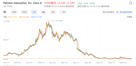 與Keep同樣享受到疫情帶來(lái)紅利的,還有Keep的對(duì)標(biāo)公司,美國(guó)健身平臺(tái)“Peloton”,Peloton的收入結(jié)構(gòu)也與Keep高度類(lèi)似。從Peloton的股價(jià)表現(xiàn)不難看出,2020年期間,Peloton股價(jià)一路高漲,市值更是一度接近500億美元。