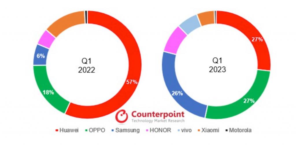 與去年同期相比,OPPO 和三星的增長十分強(qiáng)勁,整體的市場格局也從去年的華為過半占有率變成了華為、OPPO、三星三足鼎立的模式。