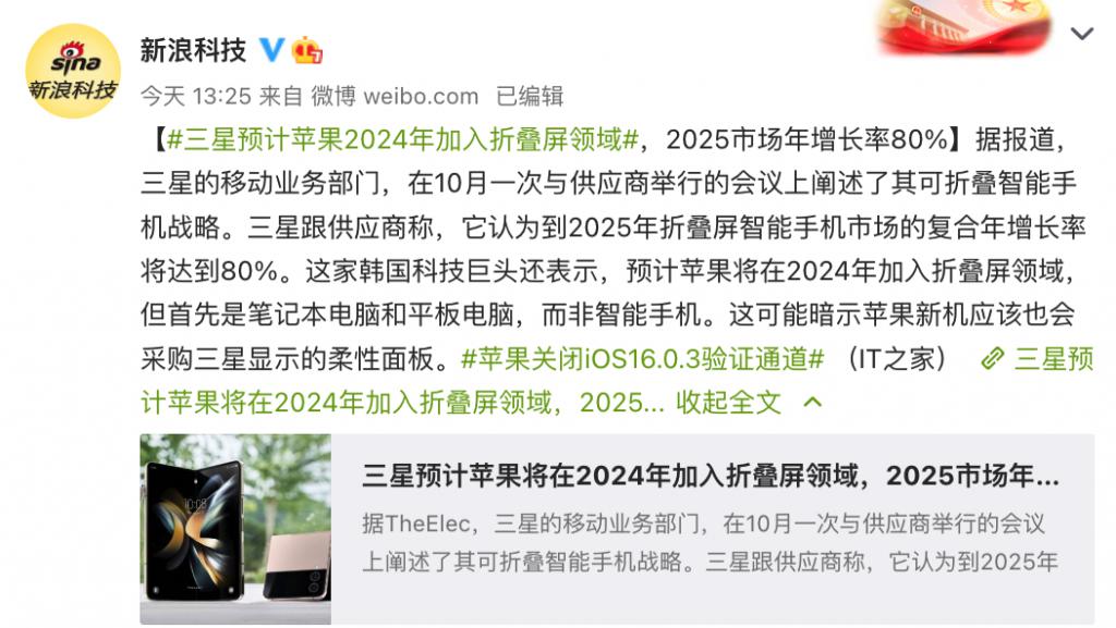 新浪科技去年的一份報道中也曾提到過,"(三星)預(yù)計蘋果將在 2024 年加入折疊屏領(lǐng)域,但首先是筆記本電腦和平板電腦,而非智能手機(jī)。"