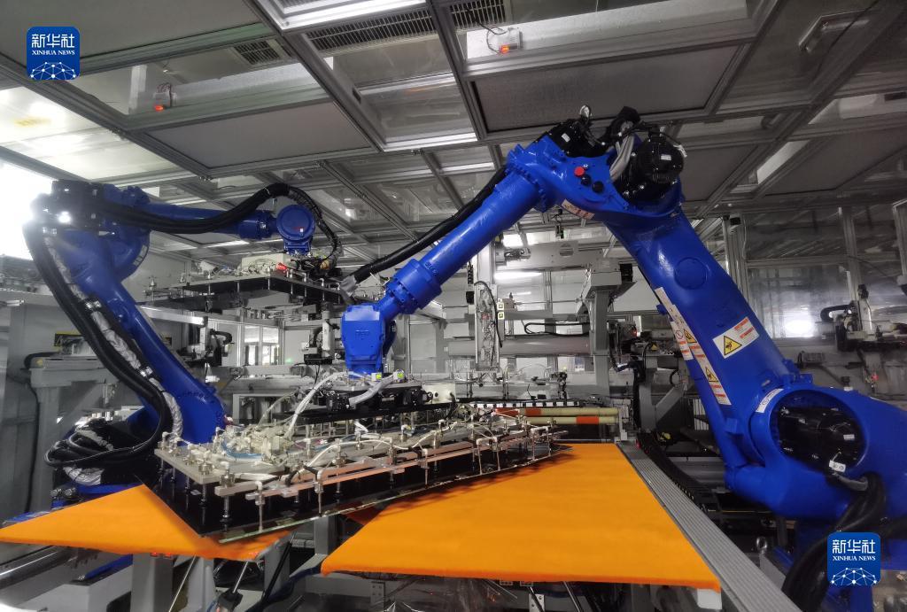 在位于青島的海信視像智能車間的生產(chǎn)線上,機器人對液晶面板和背光板自動化精準卡合(6月19日攝)。新華社記者 王凱 攝